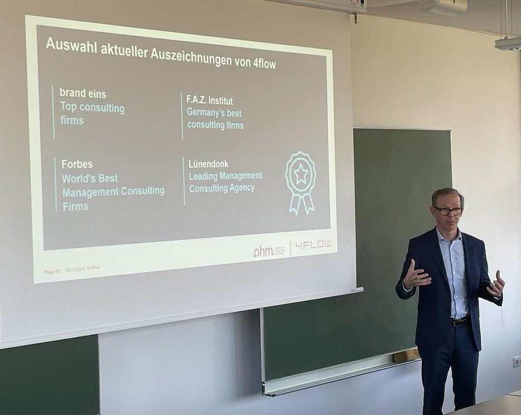 Am 4.11.2025 begrüßte Prof. Dr. Christoph Tripp, Professor für Distributions- und Handelslogistik in der Fakultät Betriebswirtschaft der TH Nürnberg, in seiner Mastervorlesung „Distribution & Handelslogistik“ zwei hochkarätige Gäste: Matthias Moch, Vice President Consumer Goods, und Finn von Hammerstein, Partner und Leiter des Münchener Büros der 4flow SE. Vor rund 25 Masterstudierenden der Spezialisierung „Logistik, Einkauf und Supply Chain Management“ sowie zahlreichen Bachelorstudierenden aus dem Schwerpunkt „Einkauf & Distribution“ präsentierten die Experten ein spannendes Projektbeispiel zur Netzwerkoptimierung eines Großhändlers.